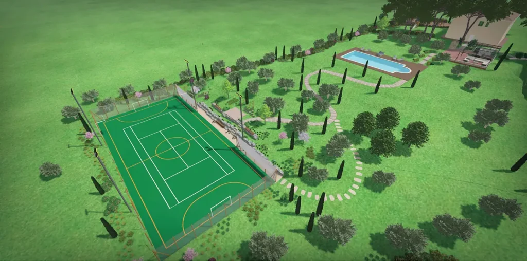 • si vuole progettare e costruire tutte le opere pertinenziali che accompagnano il giardino quali piscina, campi sportivi (tennis, badminton, padel, bocce, pétanque, beach volley ecc), aree yoga, cucine all’aperto, spazi cinema all’aperto