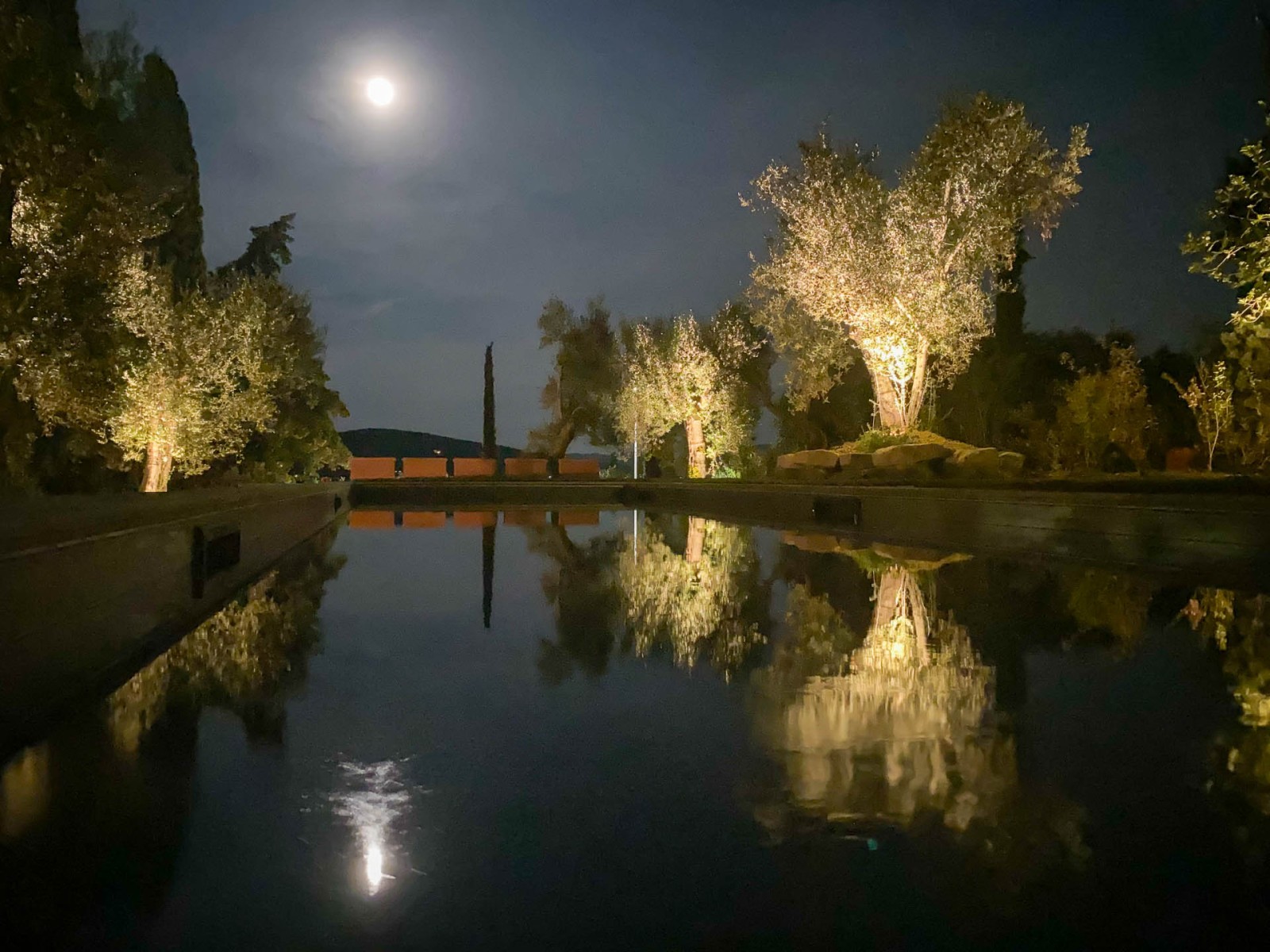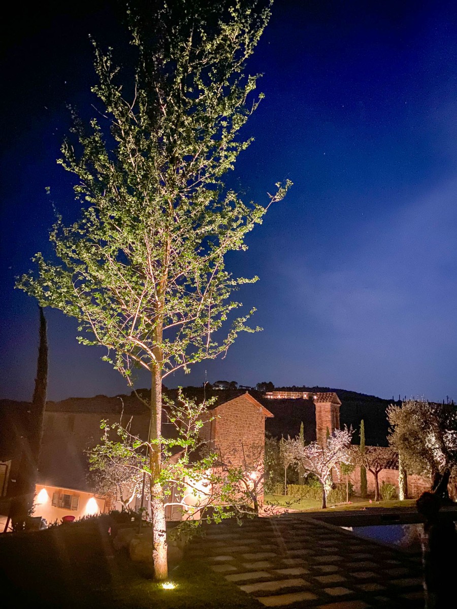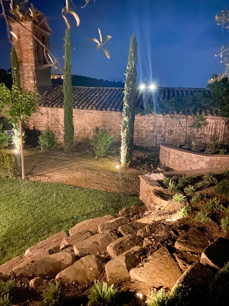 Per l’illuminazione sono state scelti incassi a pavimento per valorizzare la verticalità dei cipressi e le chiome degli olivi e segnapassi sulle scale di pietra naturale.
