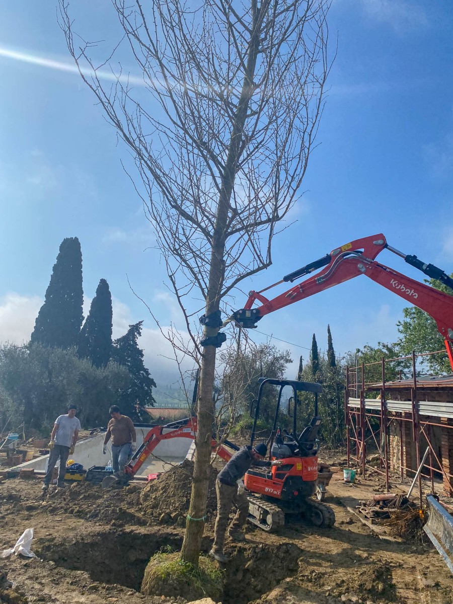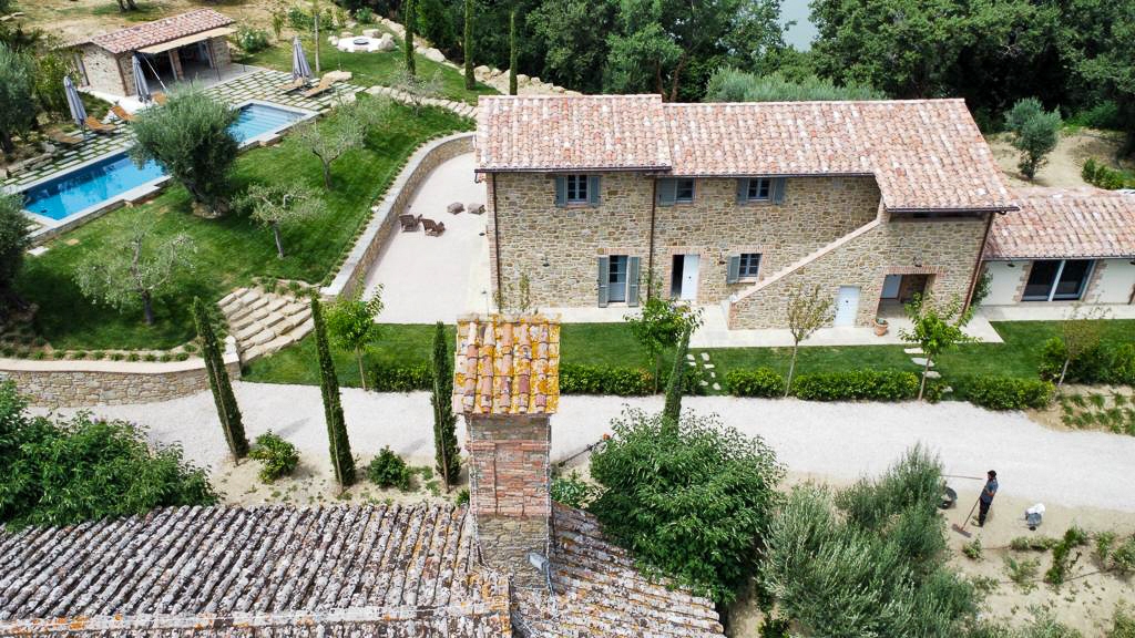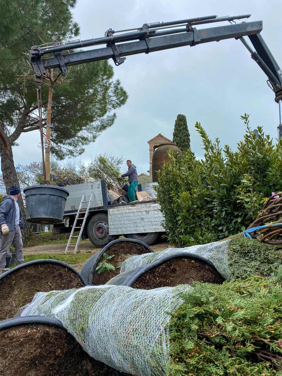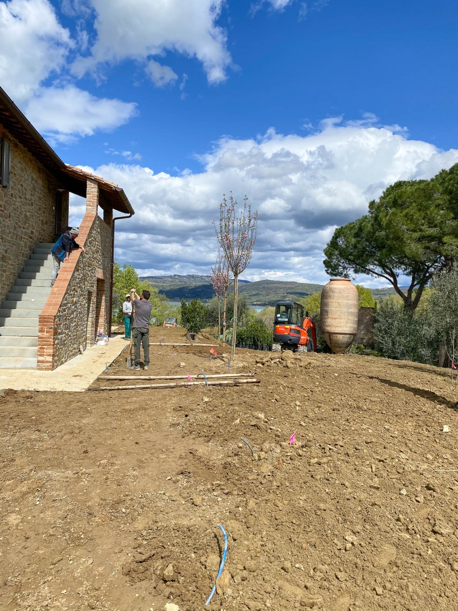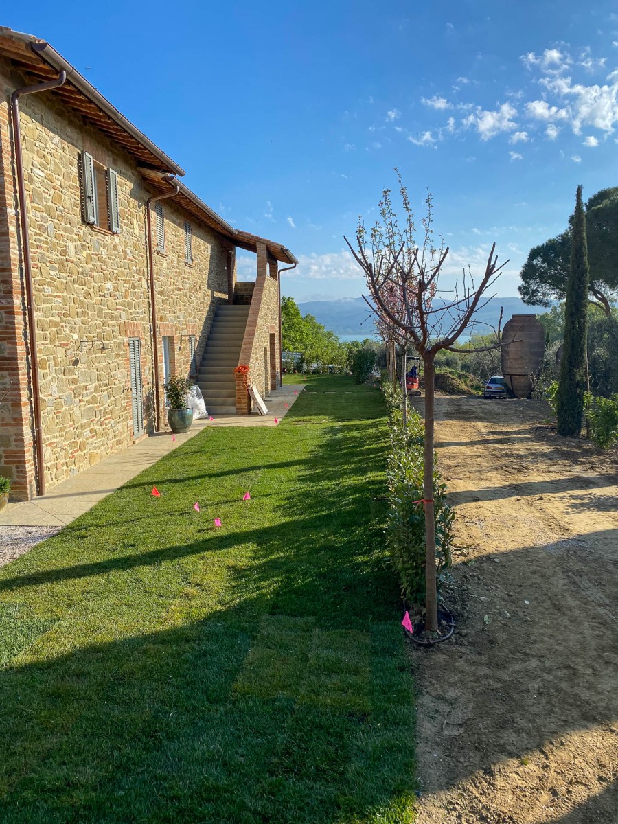 Questo giardino semplice e lineare è stato pensato per rispondere principalmente alla funzionalità dell’opera e alla necessità di risparmiare acqua: l’agriturismo da marzo a ottobre non conosce un giorno di day off e i giardinieri in questo periodo, devono essere in grado di gestire con un unico intervento a settimana la sua manutenzione. Le aree a prato irriguo sono state limitate alle sole zone intorno all’edificio e alla piscina dove si è scelto di mettere a dimora prati pronti a prevalenza di Festuca arundinacea e Poa pratensis; si è anche optato, nelle stesse zone per la sub-irrigazione, ciò ha un duplice vantaggio: permettere agli ospiti di lasciare asciugamani, cuscini e altri oggetti senza il rischio di trovarli bagnati l’indomani e riduce la presenza di zanzare e di chironomidi, quest’ultimi massivamente presenti nella zona del Lago Trasimeno.