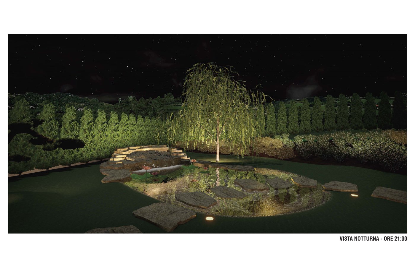 La zona a prato ospita il laghetto e un’area relax con pergola e idromassaggio, qui la componente arboreo arbustiva è composta da Salix babylonica, Pinus thunbergii o Pinus parviflora “glauca”, Cedrus deodora «Pendula», Magnolia x soulangeana, Thuja occidentalis «Smaragd».