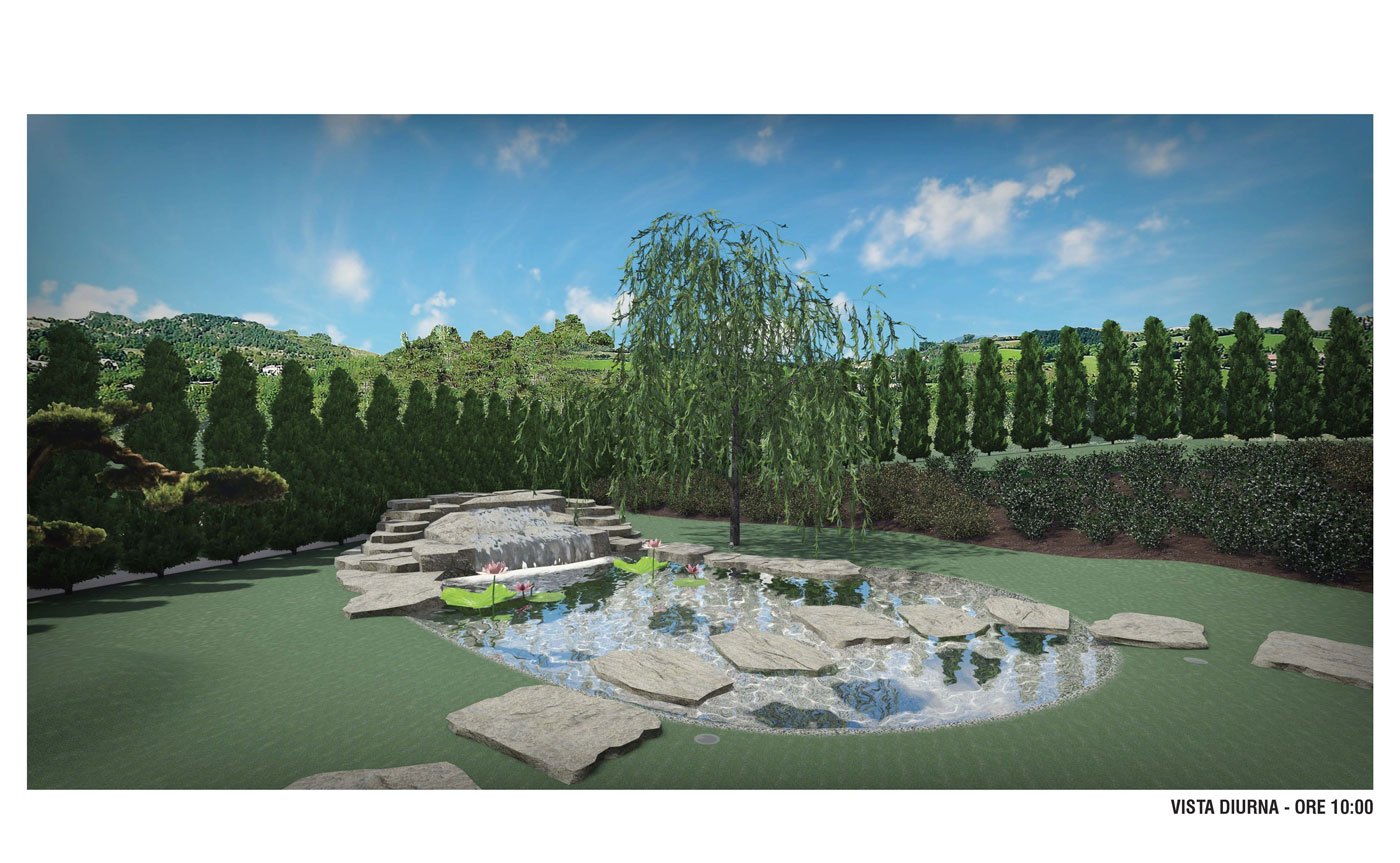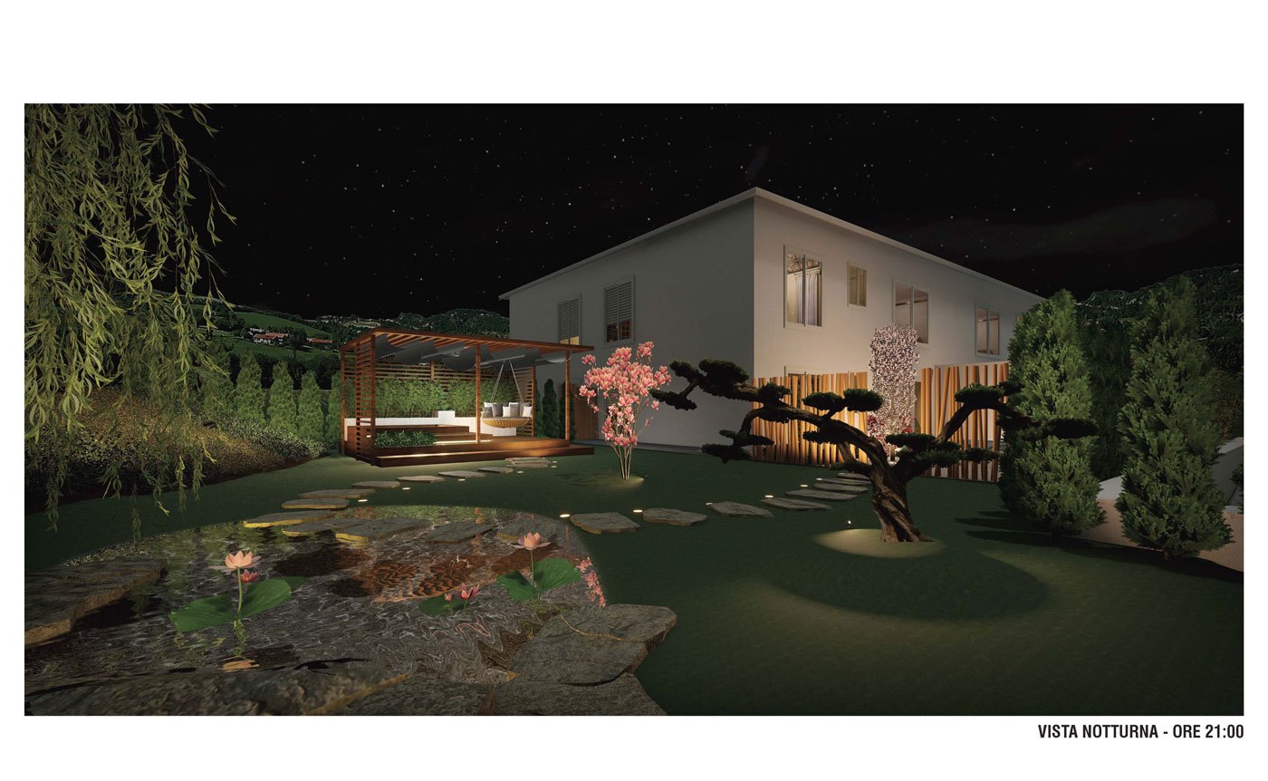 Questo giardino in stile giapponese è stato progettato da APRUS su commissione di Sopra il Muro soc. coop. per un suo cliente. L’area sulla quale realizzare il giardino è un lotto di una quadrifamiliare con una splendida vista sulla vallata sottostante. Il proprietario desiderava ricreare un giardino con elementi che ricordassero un giardino giapponese, in particolare ha chiesto la realizzazione di un laghetto e di suddividere il giardino in due zone separate per dedicare una parte del giardino ai suoi amati cani.