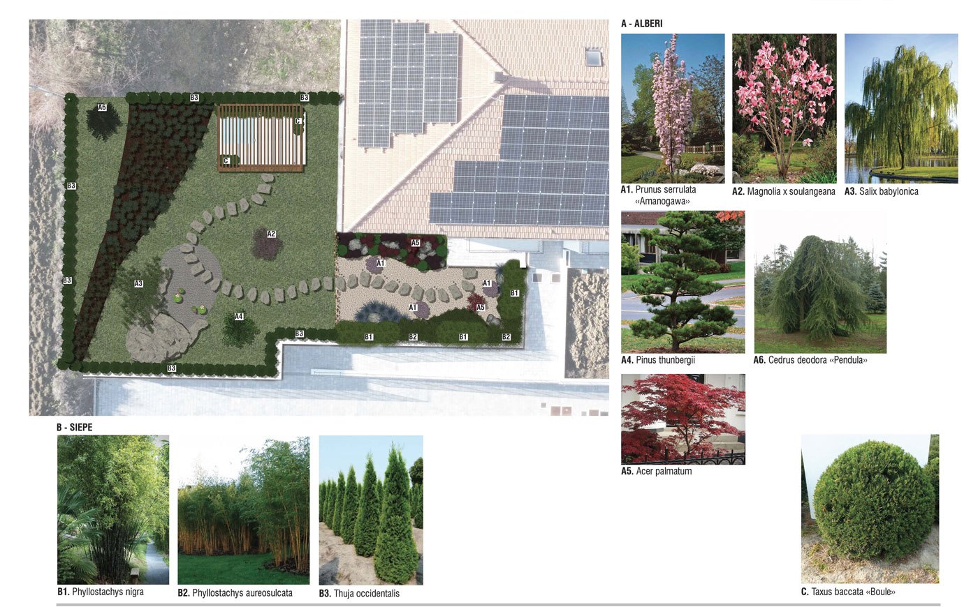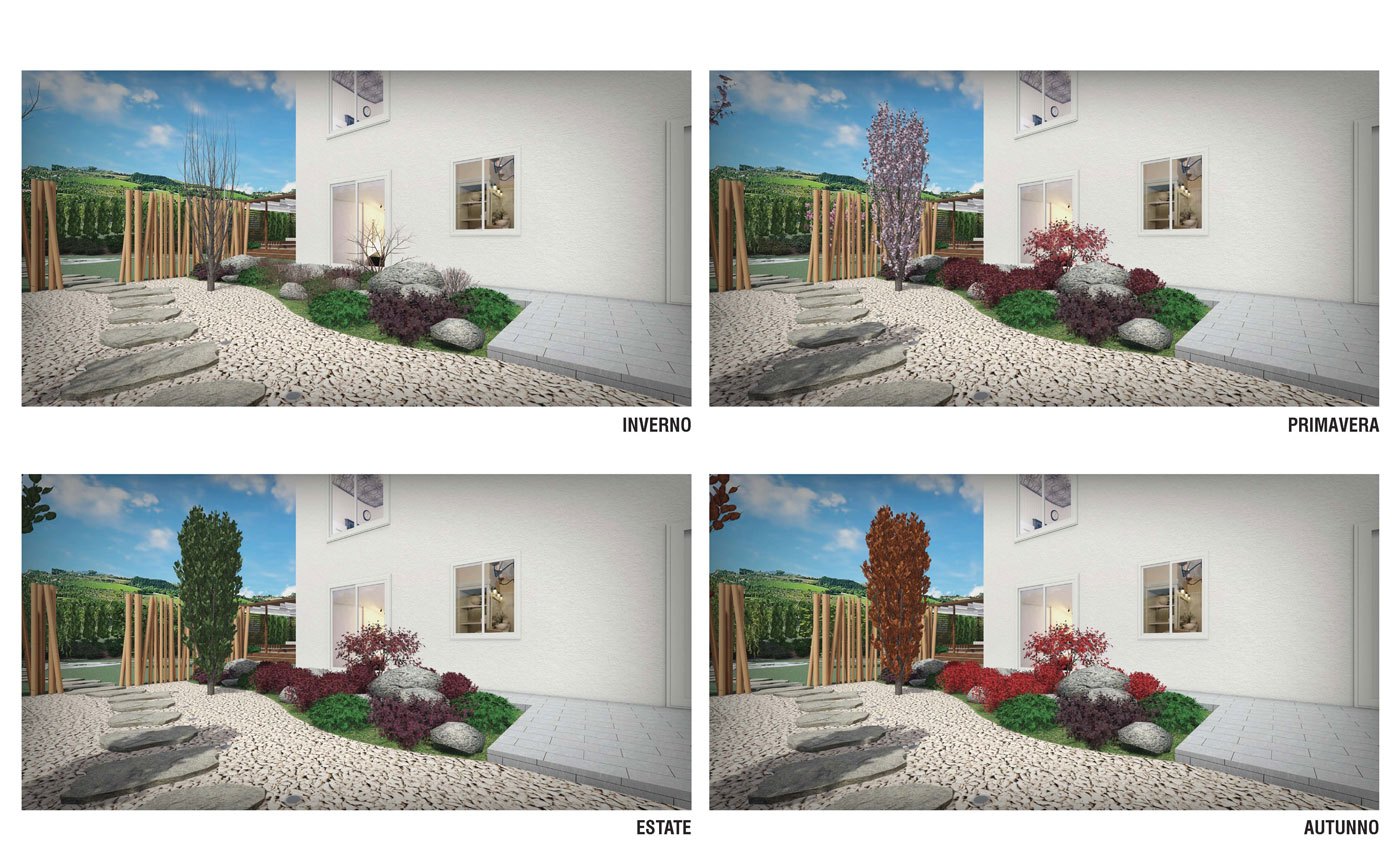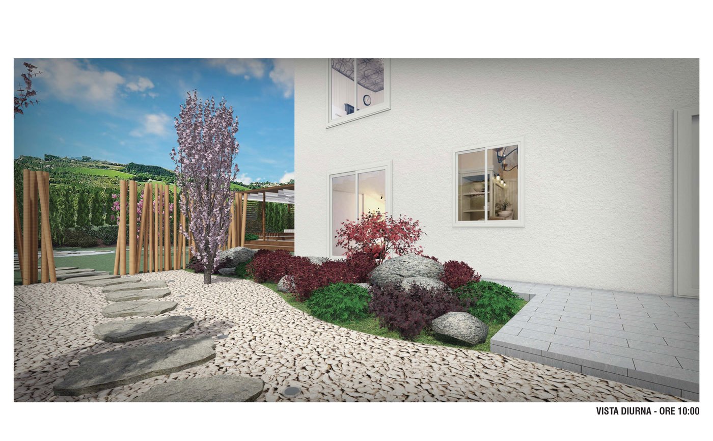APRUS ha accolto le richieste restituendo un giardino costituito da una parte caratterizzata dall’assenza di prato e una totale copertura con acciottolato di diversa granulometria separato dall’altra zona da un divisorio in canne di bamboo. A caratterizzare questa zona, dal punto di vista botanico, sono stati messi a dimora Taxus baccata a sfera, Loropetalum chinensis «Black pearl» Berberis thunbergii «atroporpurea nana», Acer palmatum, Carex morrowii «Irish green», Pleioblastus pumilus, Phyllostachys nigra, Phyllostachys aureosulcata «Spectabilis» e Prunus serrulata «Amanogawa».