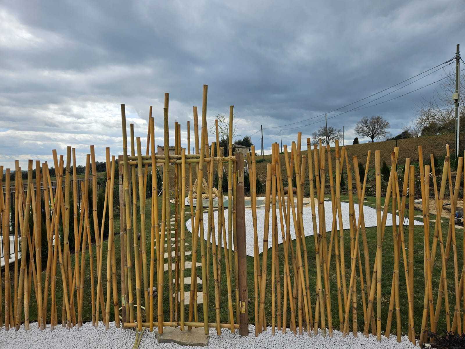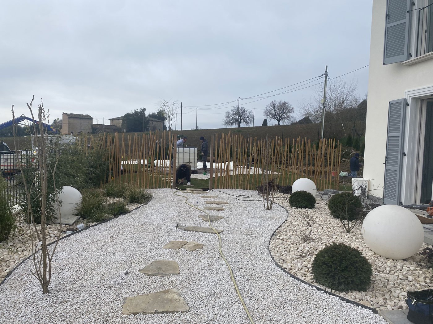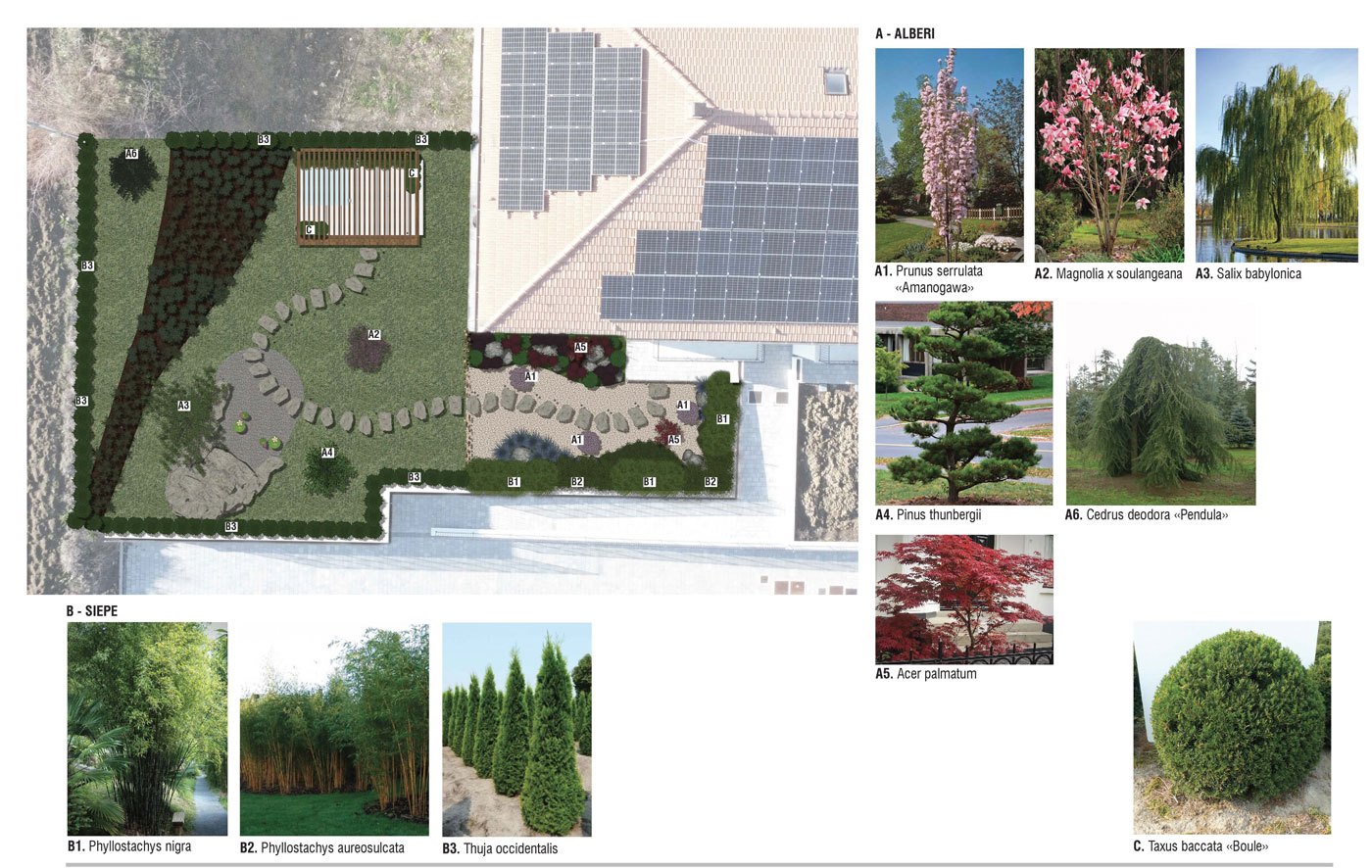 APRUS ha accolto le richieste restituendo un giardino costituito da una parte caratterizzata dall’assenza di prato e una totale copertura con acciottolato di diversa granulometria separato dall’altra zona da un divisorio in canne di bamboo. A caratterizzare questa zona, dal punto di vista botanico, sono stati messi a dimora Taxus baccata a sfera, Loropetalum chinensis «Black pearl» Berberis thunbergii «atroporpurea nana», Acer palmatum, Carex morrowii «Irish green», Pleioblastus pumilus, Phyllostachys nigra, Phyllostachys aureosulcata «Spectabilis» e Prunus serrulata «Amanogawa».