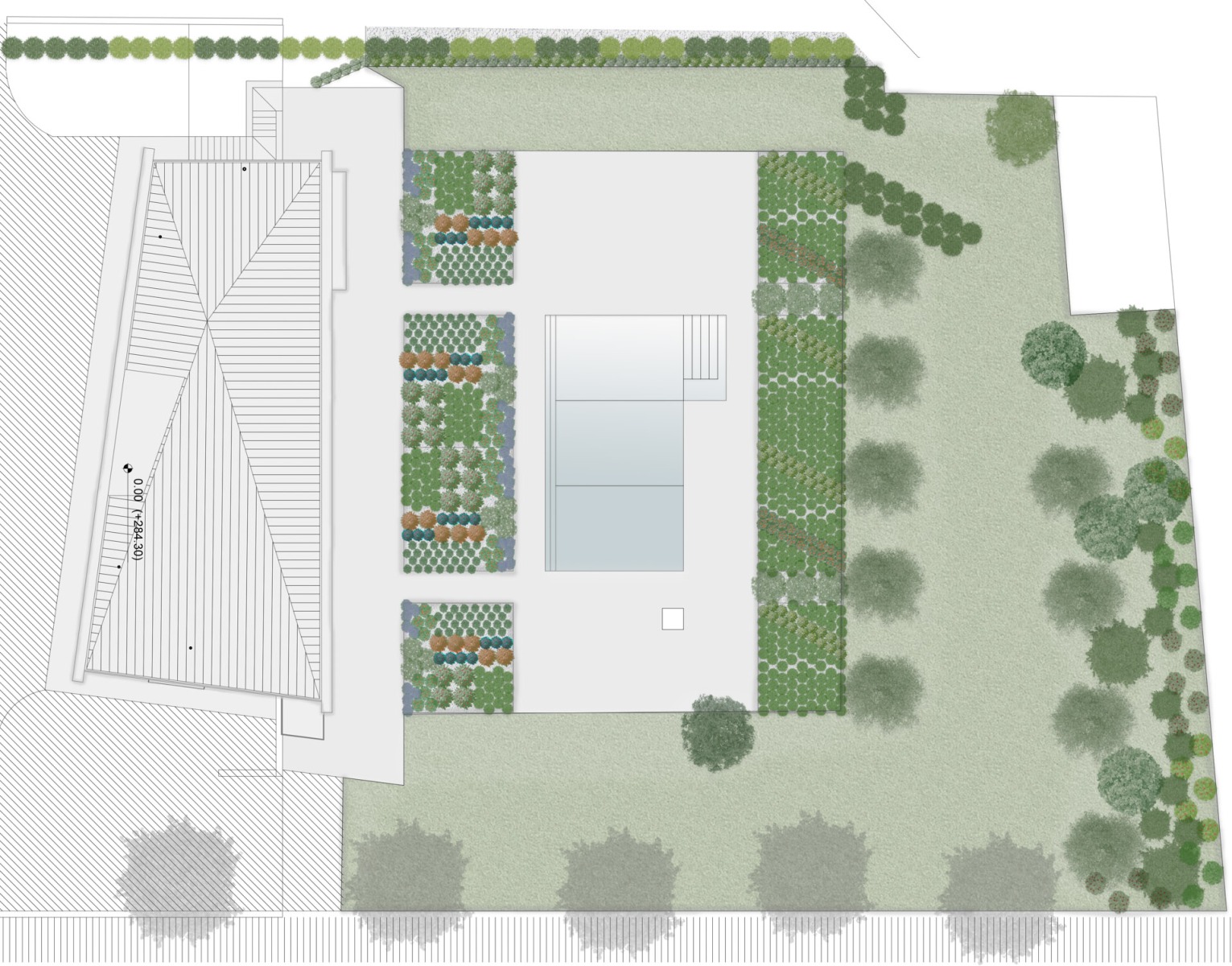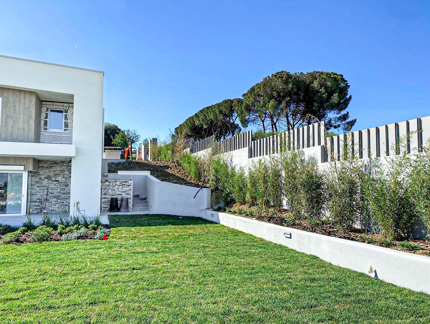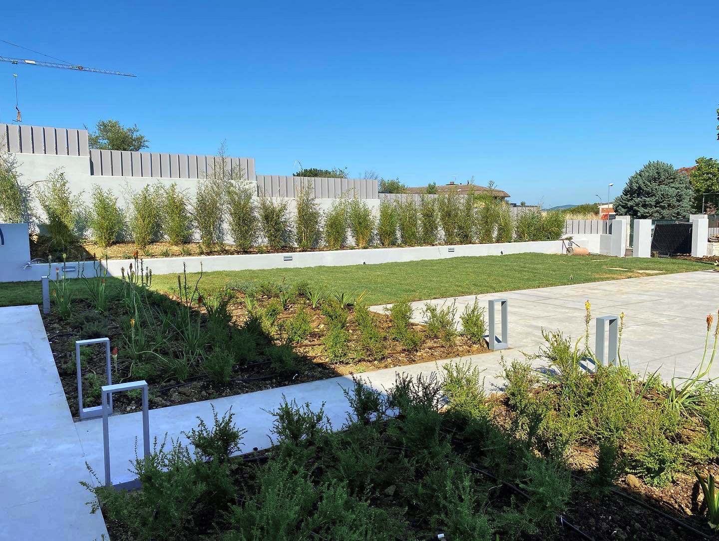 Questo giardino è stato progettato in armonia con le linee moderne dell’edificio e il design della piscina. Simmetrie e geometrie ripetute caratterizzano le grandi aiuole, idealmente stanze all’aperto composte come un mosaico verde di Grevillea “Robin Gordon”, Lonicera nitida, Kniphophia uvaria grandiflora, Nepeta x frassenii, Pleioblastus pygmaeus, Crocosomia “Limpopo”, Westringia fruticosa. La scarpata della piscina riprende il motivo geometrico delle stanze all’aperto, dove viene utilizzato Hypericum hidcote e Pleioblastus pygmaeus in una diagonale immaginaria che sdrammatizza la razionalità delle forme.