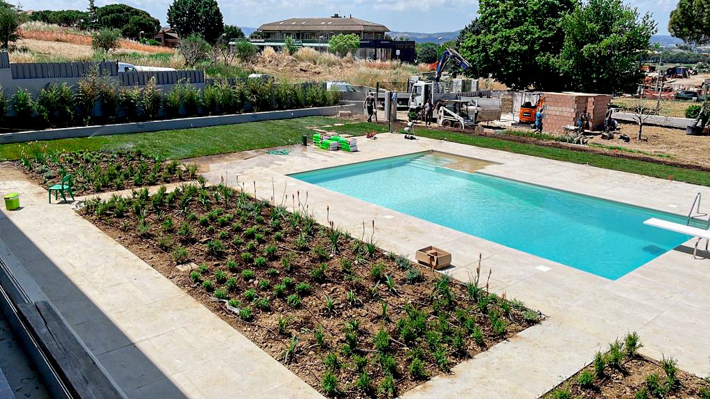 Un giardino in armonia con il design moderno dell’edificio e della piscina.