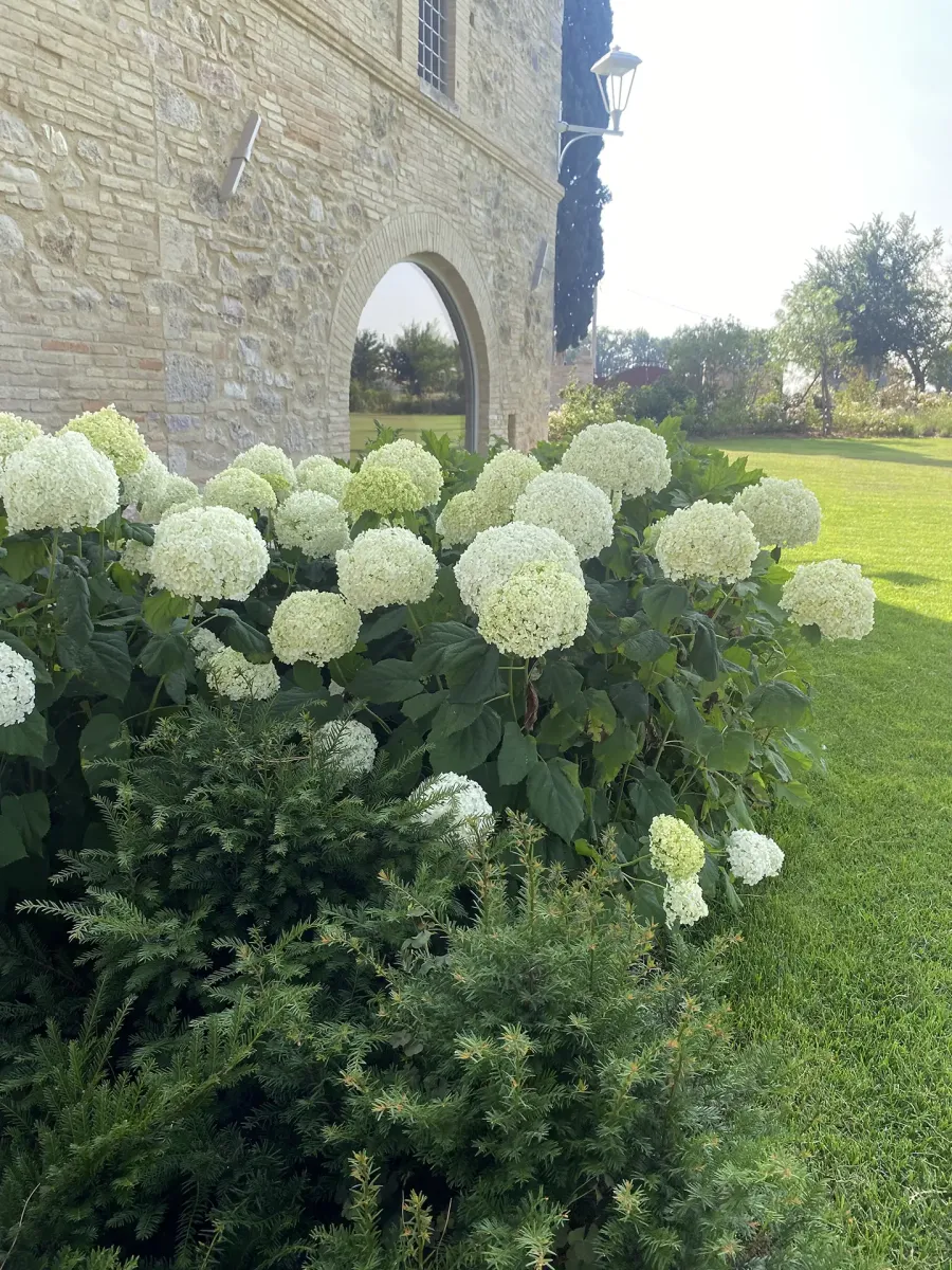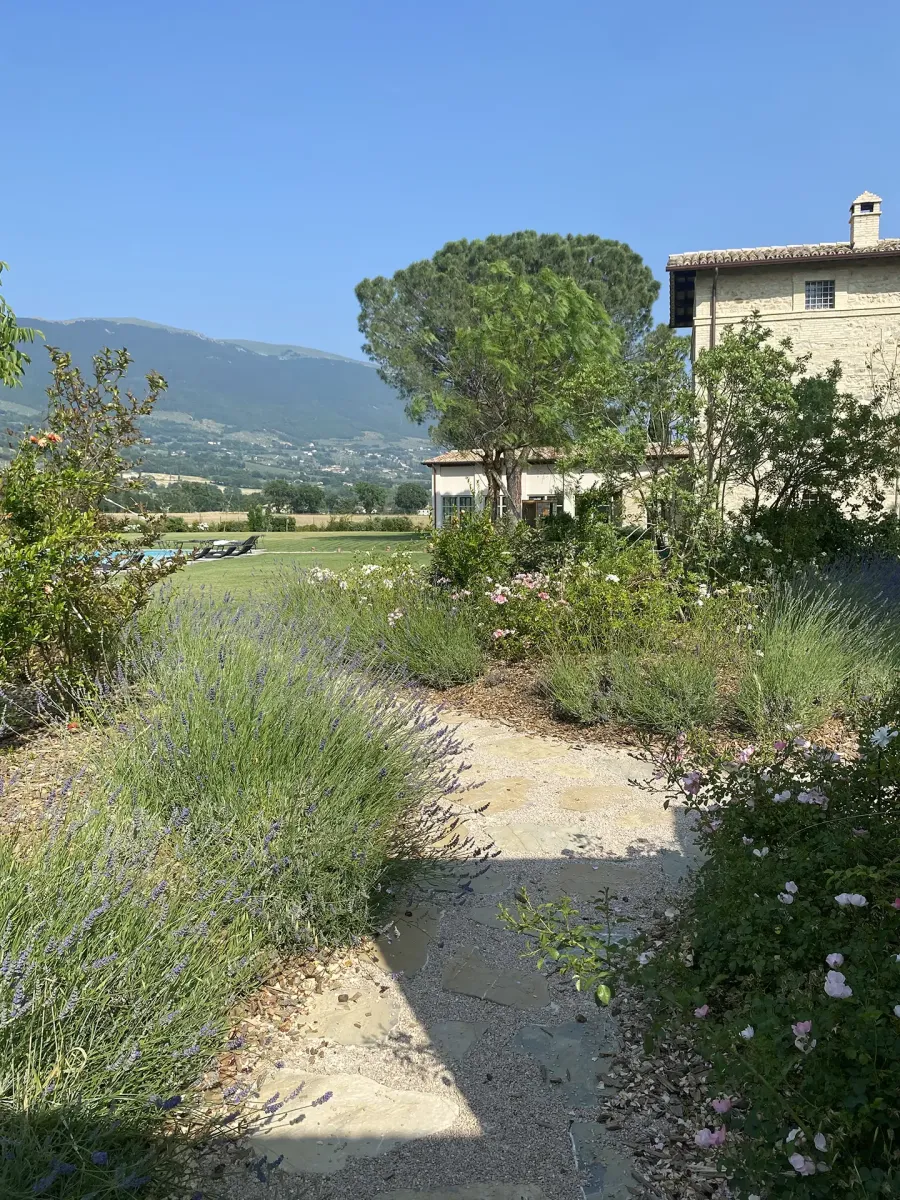 Attorno agli edifici principali si distende un ampio prato verde, definito da due diverse tipologie di siepi che ne articolano la percezione: una, più compatta e composta esclusivamente da specie arbustive, accompagna con leggerezza lo sguardo verso Assisi; l’altra, arricchita da elementi arborei, introduce verticalità e attenua in modo naturale la vista sulla campagna circostante. Le essenze selezionate, tra cui Eleagnus ebbingei, Viburnum tinus, rose paesaggistiche, Arbutus unedo, Cotinus coggygria e Teucrium fruticans, assicurano un susseguirsi di colori, forme e profumi lungo l’intero arco dell’anno.